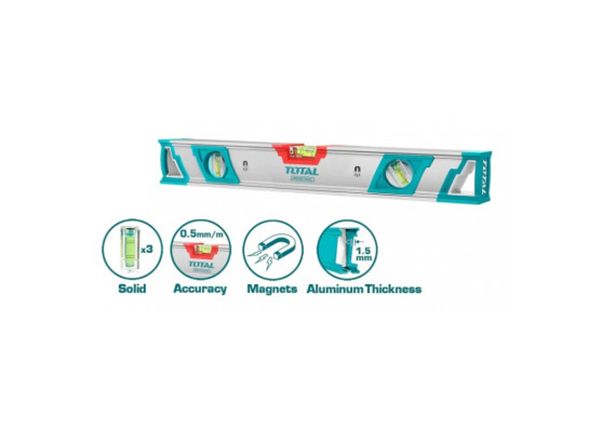 Уровень магнитный 1200мм TOTAL TMT212086M Длина 1200мм Количество глазок 3 шт. Наличие магнита - да Уровень магнитный TOTAL TMT212086M — измерительный прибор, определяющий отклонение поверхности по горизонтали и вертикали. Оснащен двумя мощными магнитами. Точность пузырьков составляет 0,5 мм/м, что обеспечивается двухсторонним фрезерованием поверхности изделия. Алюминиевый корпус толщиной 1,5 мм обладает прочностью и выдерживает значительные нагрузки.